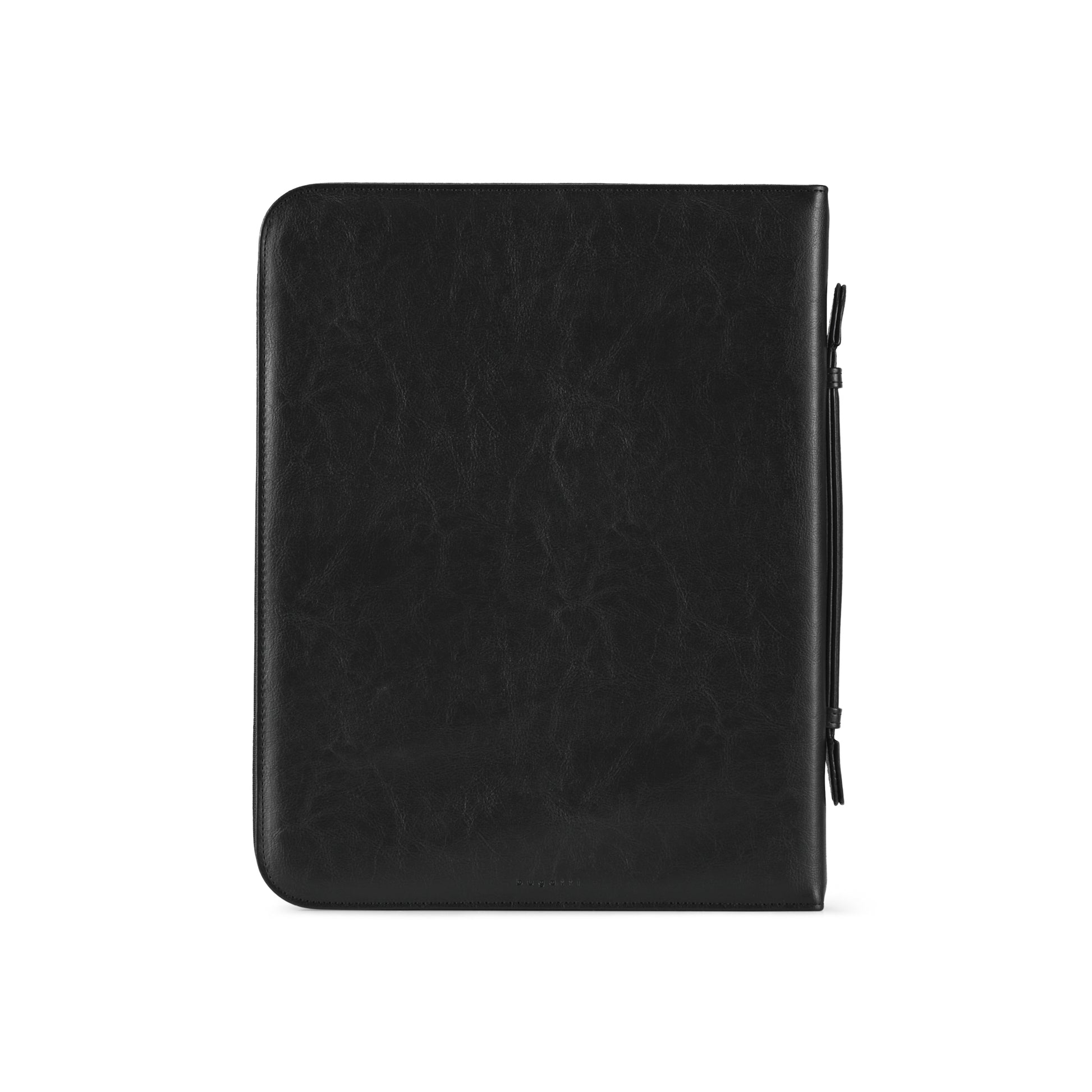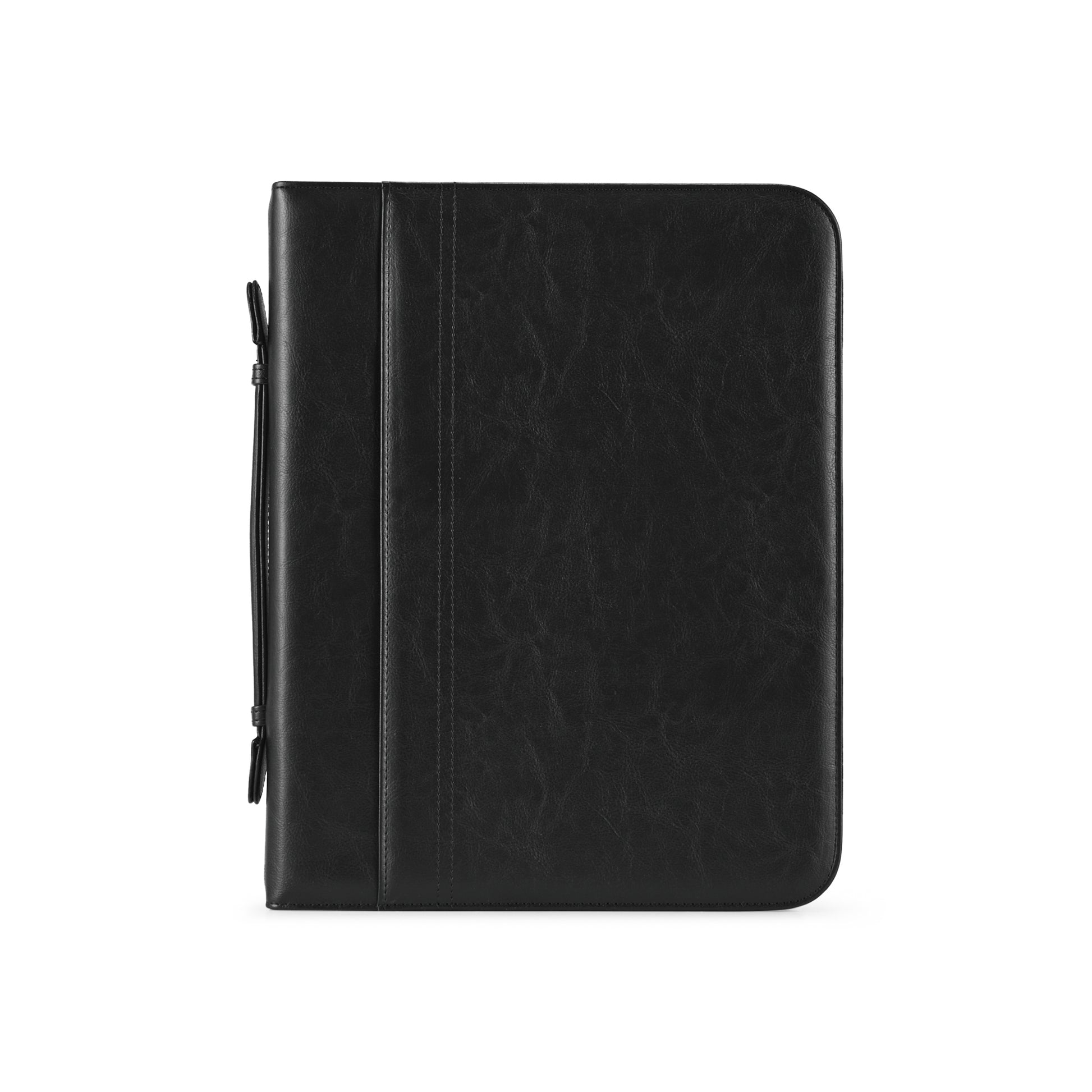 Discover our sleek black writing case made from durable vegan leather, featuring a built-in organizer, 2" ring binder, and secure zip-around closure for ultimate convenience.
