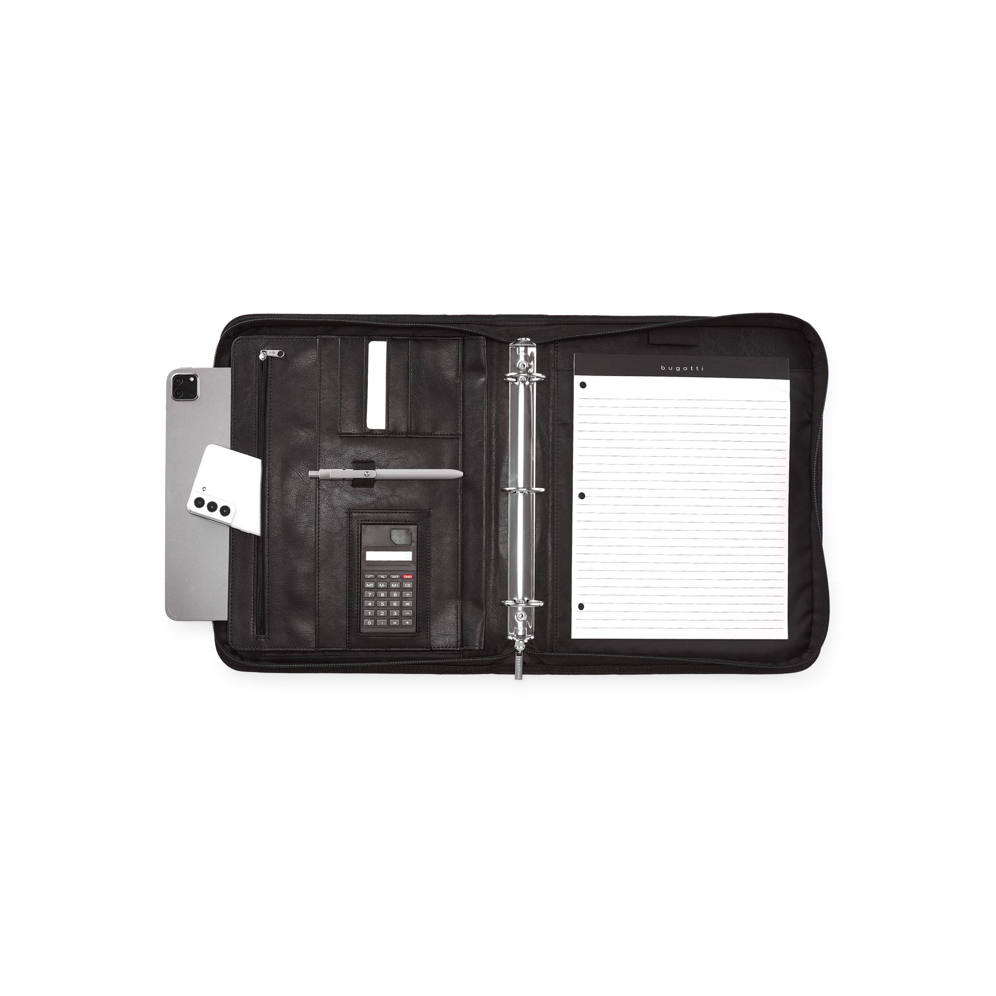 - Includes a built-in organizer with a spacious document compartment, 2" ring binder, slots for notes and business cards, a calculator pocket, and a pen loop