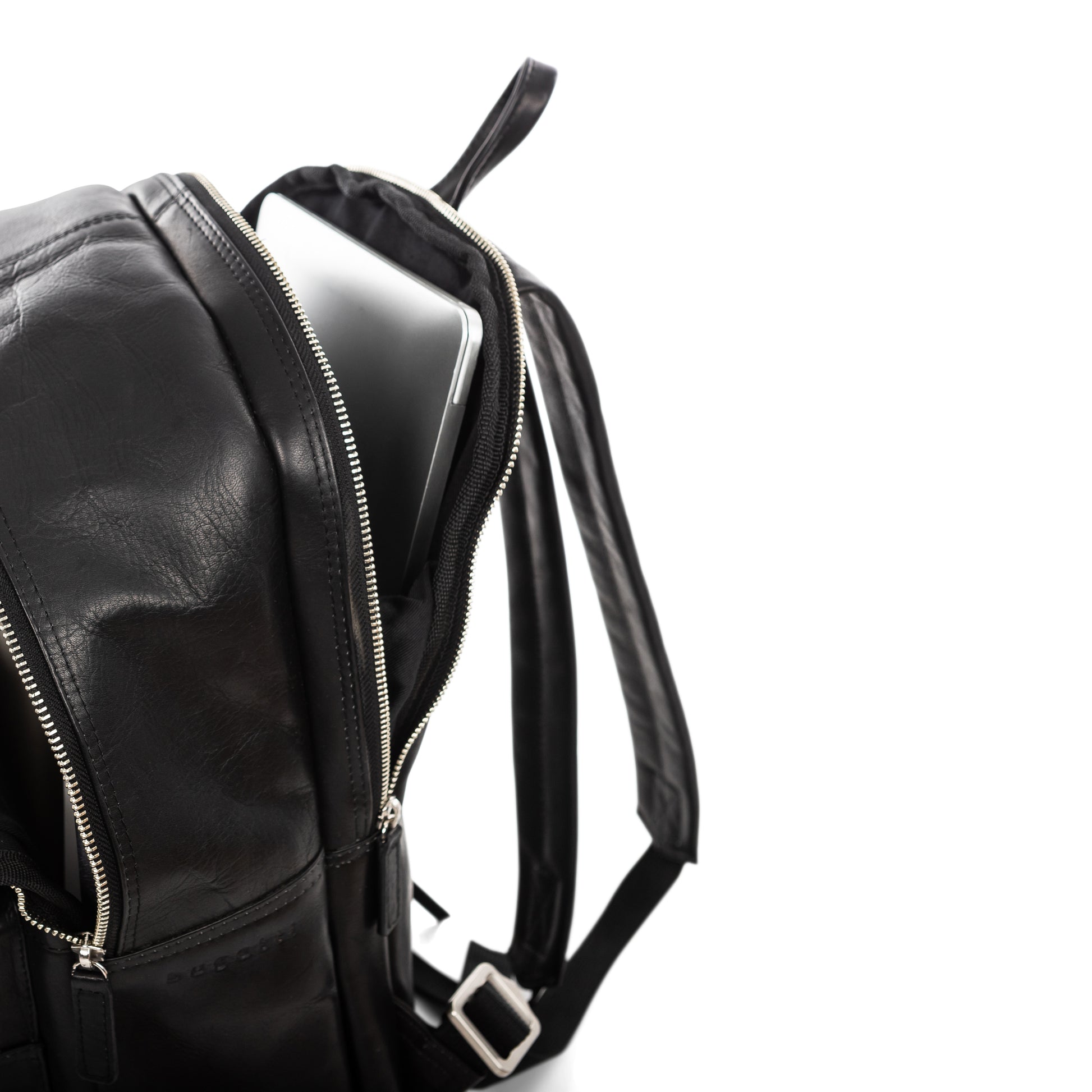 Discover our stylish Colombian leather backpack featuring a zippered main compartment, a convenient strap for suitcase attachment, multiple interior pockets with an integrated organizer panel, and a padded laptop section that accommodates devices up to 14 inches. Perfect for on-the-go professionals!