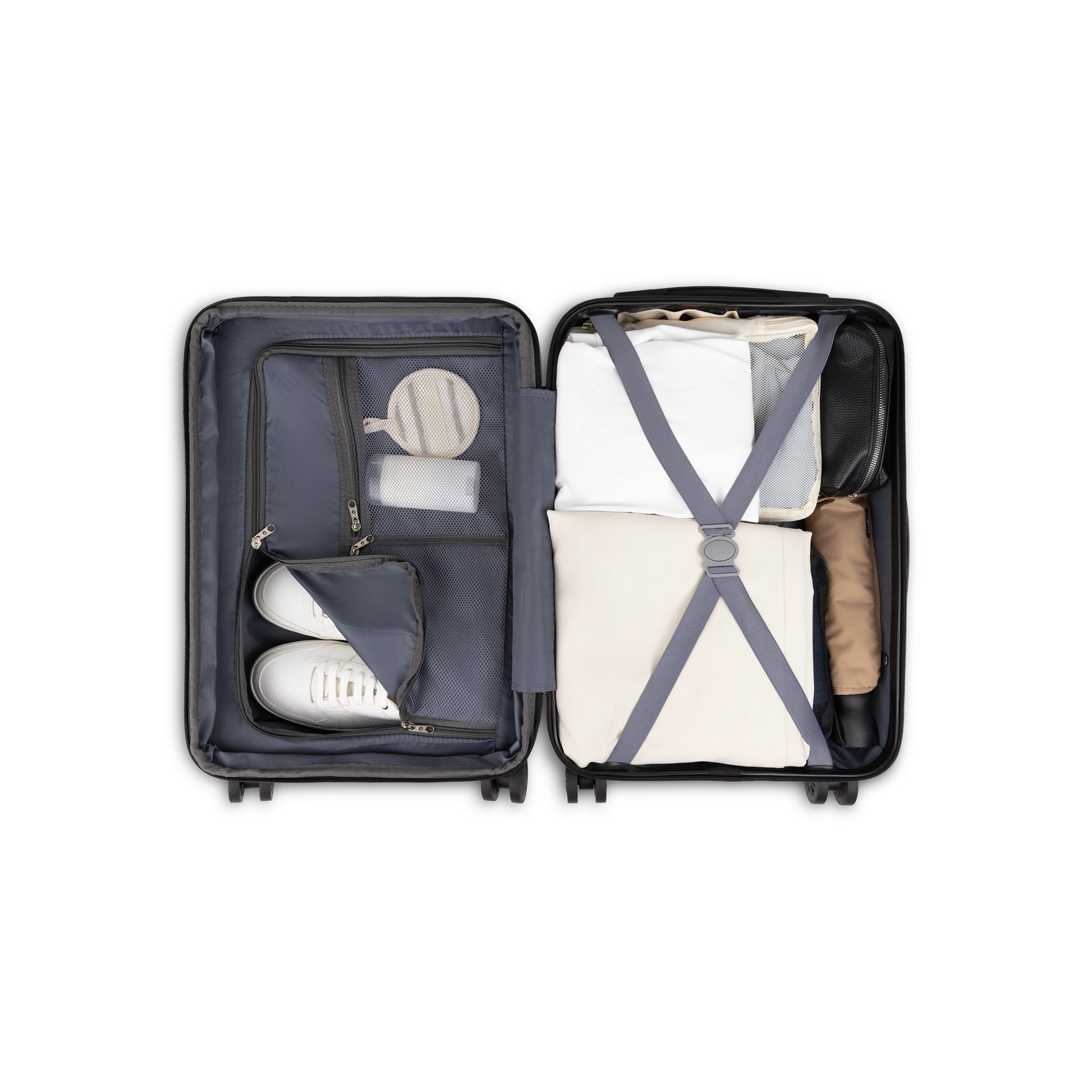 - The suitcase's outer shell is made from recycled material, using 48 500ml PET bottles or 32 2L post-consumer PET bottles.