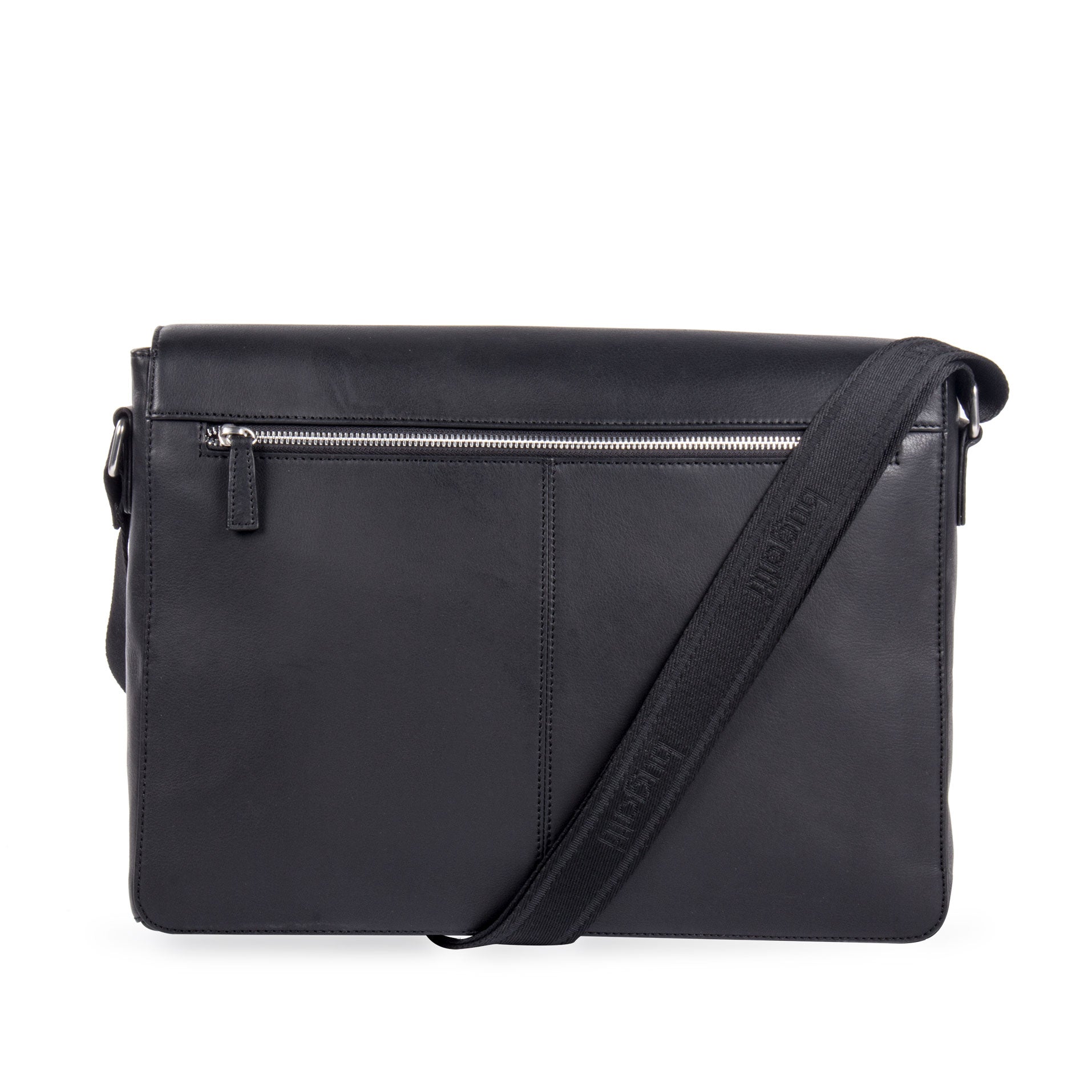 - Messenger bag with front zippered pocket.
