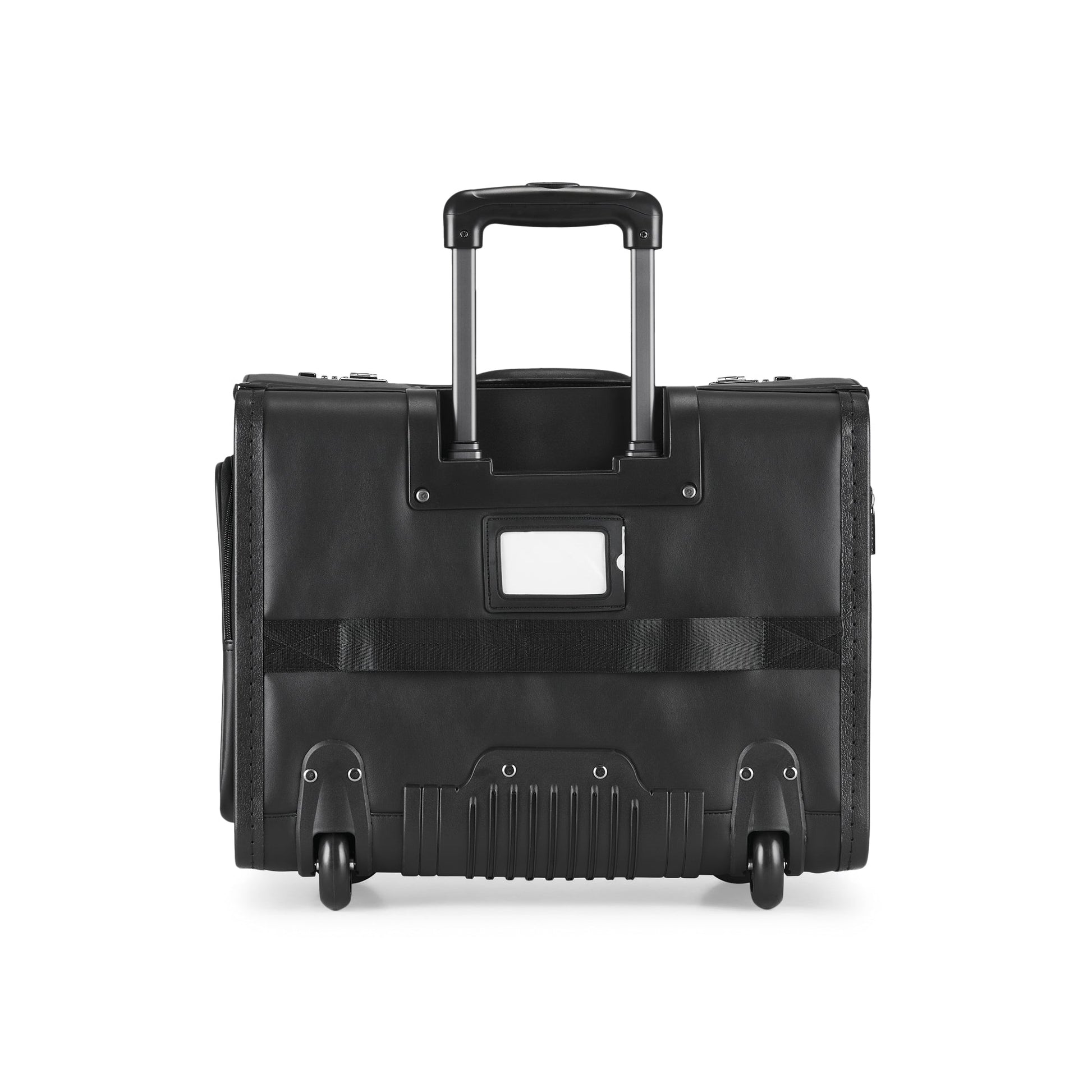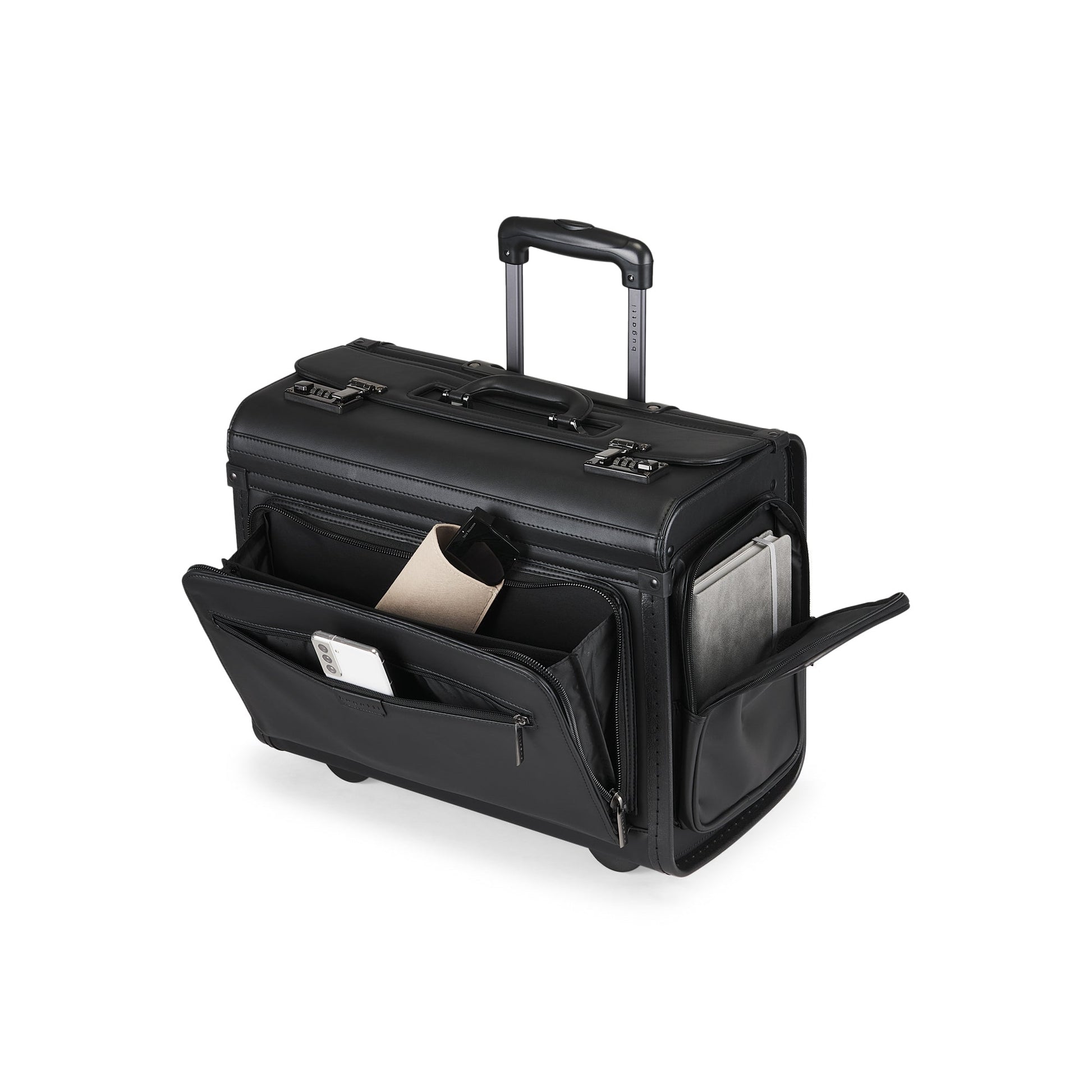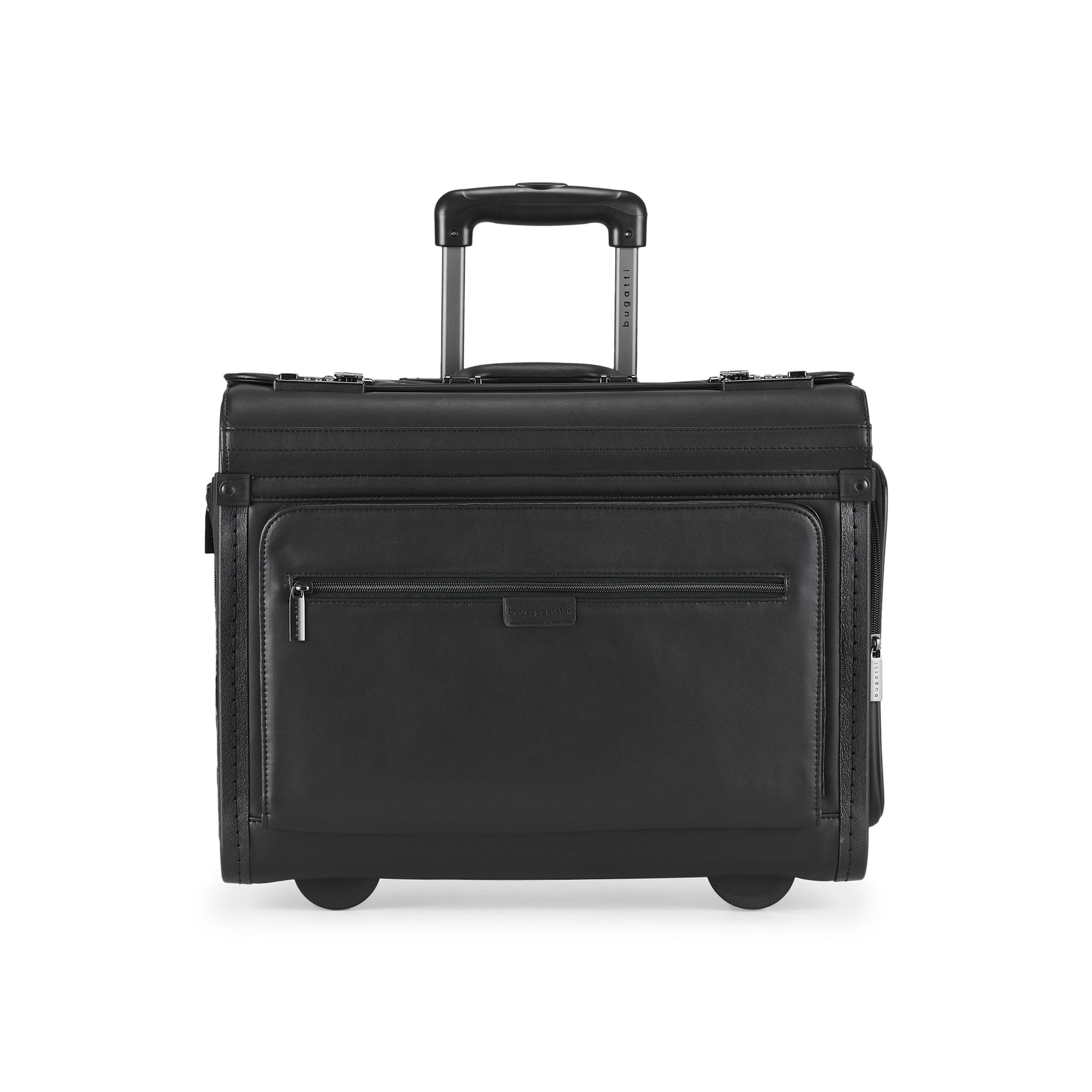 Discover the vegan leather hard case boasting maximum loading capacity, a padded laptop section, versatile compartments, and secure dual locks for your 15.6" laptop. Travel in sophistication with a reinforced handle, telescopic handle, corner wheels, and stabilizing feet.